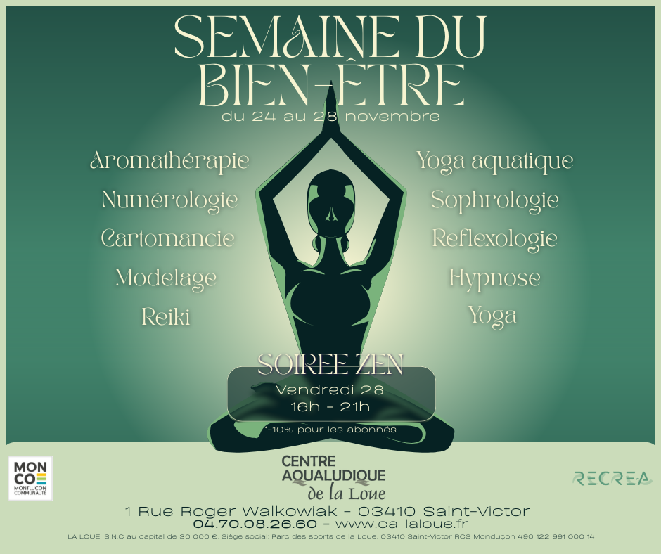 Au nord de Montluçon, découvrez le centre aqualudique de La Loue situé dans le ville de Saint-Victor. Il met à disposition un espace aquatique où vous pourrez pratiquer librement la natation et vous adonner à tous les loisirs liés à l'eau. Vous y retrouverez un bassin sportif de 50 mètres avec 8 lignes d'eau, ainsi qu'un bassin à l'extérieur d'une longueur de 25 mètres. Un bassin ludique est également accessible à tous pour les loisirs et la détente, ainsi qu'une pataugeoire et un toboggan de 60 mètres pour les plus jeunes. Le centre met à disposition deux fosses à plongée de 6 mètres et 20 mètres de profondeur pour toutes personnes voulant s'initier à la plongée. Un espace bien-être est disponible dans votre centre aquatique avec un sauna, un hammam et un jacuzzi pour vous ressourcer et profiter d'une bulle de détente. Enfin, les plus sportifs pourront profiter d'un espace forme pour s'entrainer grâce à des appareils cardio-training et de musculation.